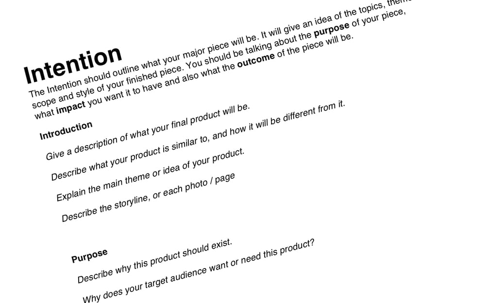 A document that has guiding questions to help students write an Intention for their Media SATÂ